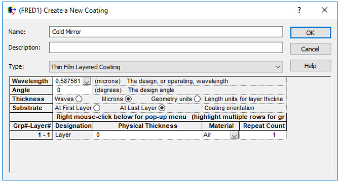 FRED中可以指定幾種膜層類型,例如采樣膜層,薄膜膜系,四分之一波長單層膜層,一般采樣膜層(入射角,波長和偏振相關),偏振片/波片膜層(瓊斯矩陣) 和腳本膜層。 在此案例中,使用Thin Film Layered Coating類型(圖1)創建冷鏡。