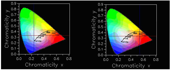圖5.圖中十字線表示的光束反射(左)和透射(右)分量的平均色度坐標。通過將分析面減少到一個像素并評估其彩色圖像來確定該值。