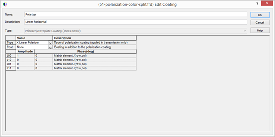 偏振片是通過偏振鍍膜來實現的,如下新建偏振鍍膜。右擊鍍膜文件夾,新建鍍膜,類型選擇偏振/波片鍍膜瓊斯矩陣(Polarizer/Waveplate Coating jones matrix),然后默認的就是沿x軸偏振鍍膜。