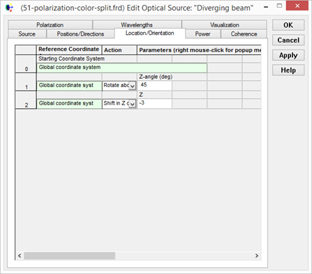 晶體的光軸或者漸變折射率材料(GRIN)的方向可以在 Tools -> edit/view GRIN/Birefrigent Material position/orientation (查看調整漸變折射率材料/雙折射材料位置方向)中調整,分別選者材料和元件,調整位置或角度,如下圖所示。