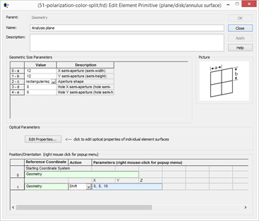 在幾何結構文件夾下(geometry)下右擊,新建基本元件(create element primitive),平面(plane),半長寬分別是10單位,旋轉 -45度,向z軸負方向平移5個單位。把偏振鍍膜套用在偏振片上。