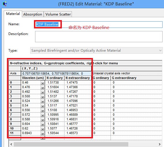 步驟1:創建雙折射材料KDP(磷酸二氫鉀晶體),命名為KDP Baseline。在樹形文件夾中選擇Materials>Create a New Material>Sampled Birefringent and/or Optically Active Material,按照如圖所示的數據輸入如下數值(KDP材料的創建方法請見本文后的備注)。