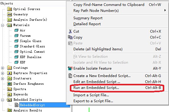 步驟3:創建一個折射率隨溫度變化20k后的折射率變化模型,我們利用FRED軟件自帶的VB腳本實現此功能。在樹形文件夾選擇Embedded Scripts,右鍵選擇Create a New Embedded Scrips,注意刪除腳本編輯器里面的所有內容,然后粘貼如下的程序到此編輯器中。