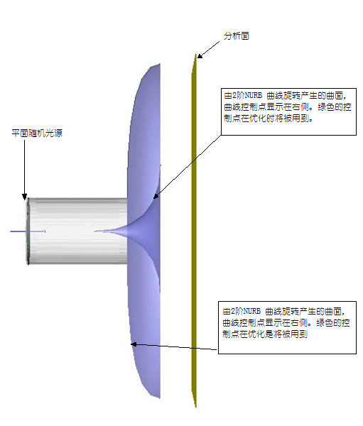 如下圖所示,導光管的兩個表面都是由2階NURB 曲線旋轉構成。優化過程用到某些控制點的坐標和比重作為變量,在優化過程中改變導光管的形狀。如下圖所示,綠色的點是在優化過程中將要改變的控制點