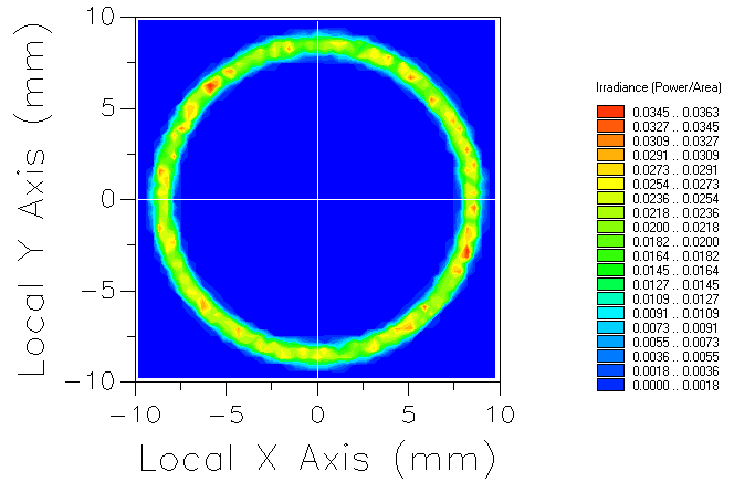 導光管的一端設定有平面隨機點光源,在初始狀態下,分析面上的輻射分布如下圖