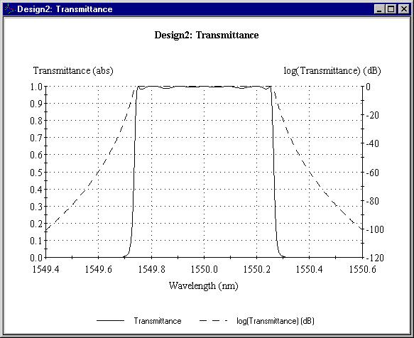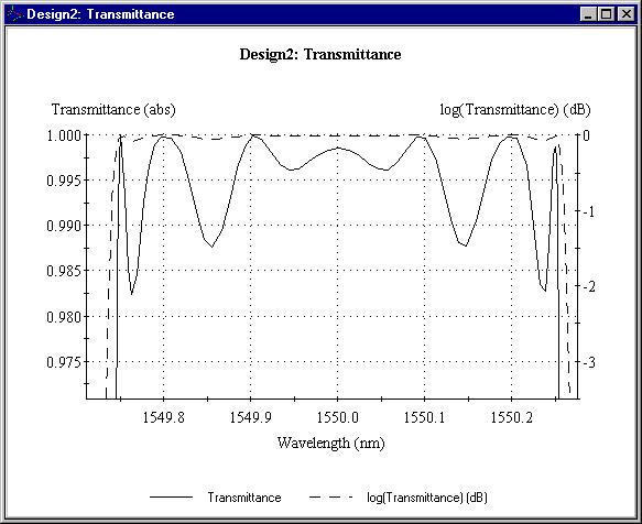 上圖顯示的是用DWDM助手、加上二層非-1/4波長匹配結構產生的濾波器設計的特性曲線。下圖顯示的是通帶部分的放大圖。
