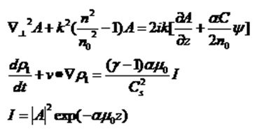 本例介紹了模擬激光在大氣中傳輸時熱暈效應對應的bloom命令的使用。描述熱暈的基本方程包括波動方程和流體力學方程。首先由Maxwell方程得到激光波動方程,再結合流體力學中的三個守恒定律——質量守恒定律、動量守恒定律、能量守恒定律得到描述熱暈效應的方程。對于理想氣體,在等壓近似下得到: