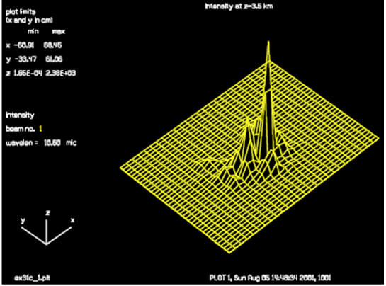 本例對比了三種情況下的激光遠場分布:(1)沒有大氣像差和熱暈效應下的遠場光強分布;(2)沒有大氣像差但有熱暈效應下的遠場光強分布;(3)同時考慮大氣像差和熱暈下的遠場分布。通過對比我們會發現熱暈效應會使光束焦點前移,焦斑沿垂直光軸方向發生位移,焦斑畸變,尺寸變大。