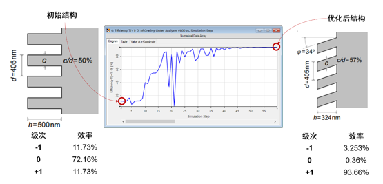 通過高速物理光學(xué),可以對1D和2D微納光柵進行嚴格的電磁分析,獲得相應(yīng)的近場、衍射級次以及衍射效應(yīng),同時能夠?qū)鈻胚M行優(yōu)化,以獲得所需要光柵結(jié)構(gòu)參數(shù)并集成到整個光學(xué)系統(tǒng)中進行分析。