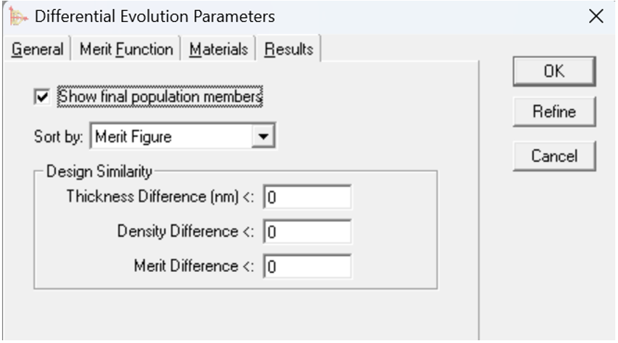 現在可以檢查和保存差分進化中的最終種群。Differential Evolution Parameters對話框的Result選項卡用于指定如何顯示種群。Design Similarity用于將相似的設計組合在一起,以便在最終種群中顯示的設計數量可以保持在合理的數量。