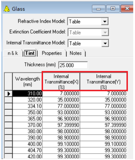 材質定義現在可以為X和Y軸提供單獨的內部透射率定義。當存在內部透射率定義時,X軸和Z軸的折射率必須相同。