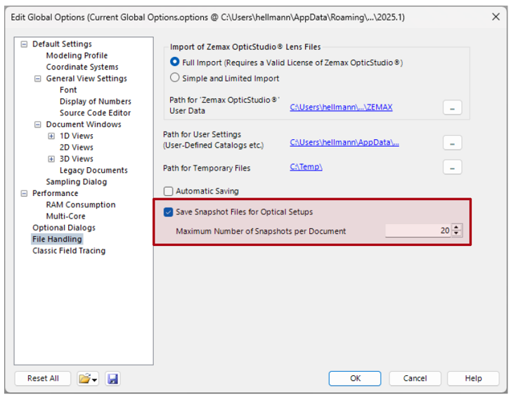 ‐ 在 VirtualLab Fusion 中,可將任何光學設置的最大快照數量設置為全局選項。