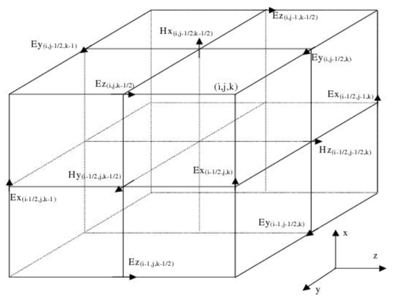 FDTD依賴于求解域的空間和時間的離散化。耦合的電磁場沿著由Yee單元組成的網(wǎng)格進行離散化。磁場和電場分量以交錯的方式定位在每個單元的邊緣上。 通過計算立方體的相對邊緣上的兩個場分量之間的有限差分,可以獲得場的空間導數(shù)的二階近似。有限差分法同樣用于近似場的時間導數(shù)。用于計算和更新每個時間步的電場和磁場的模擬空間的算法稱為Yee算法。當空間和時間步長趨于零時,計算問題的解的精度應(yīng)收斂。這種增加的準確性是以完成模擬所需的時間和存儲模擬所需的內(nèi)存為代價的。
