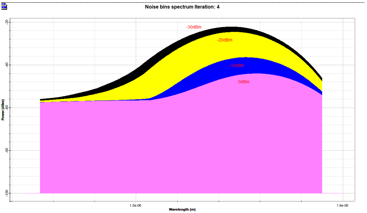 最后,分析了輸入信號功率變化時噪聲譜的變化。在這種情況下,對前向噪聲進行了分析。圖4顯示了4種不同輸入功率:-30 dBm、-20 dBm、-10 dBm和0 dBm時的頻譜。我們可以看到噪聲峰值功率隨著輸入信號功率的減小而增大。