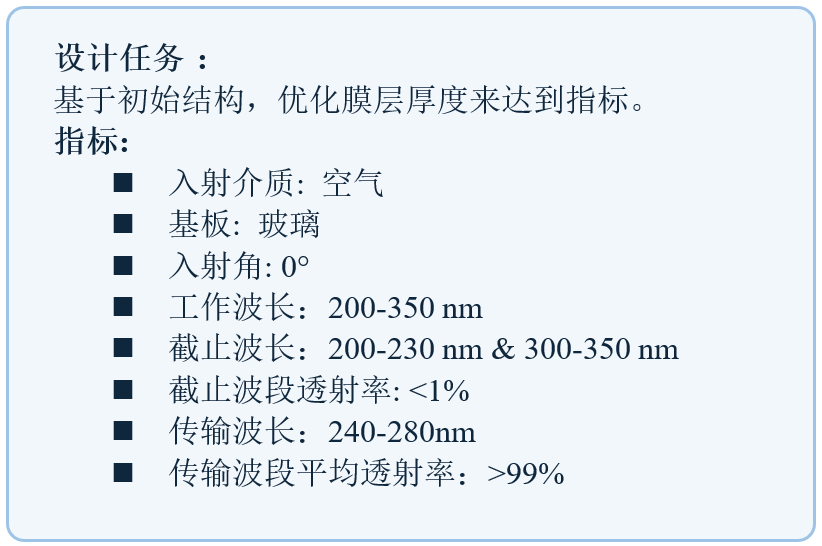 通過優化初始結構的膜層厚度,目標是設計一款在 0° 入射條件下,240–280 nm 波段平均透射率大于 99%,并在 200–230 nm 與 300–350 nm 波段實現平均透射率低于 1% 的紫外帶通濾光膜。