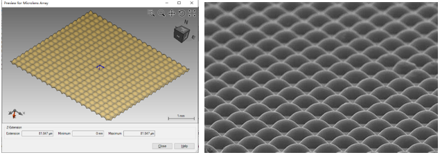 左圖:VirtualLab Fusion設計的微透鏡陣列 右圖:加工的微透鏡陣列結構