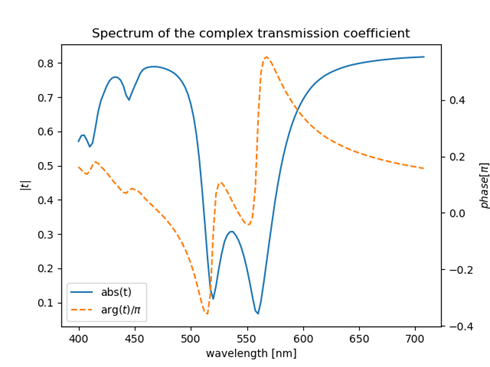 下圖描繪了透射系數的幅值和相位(由于對稱性,這與偏振性無關):