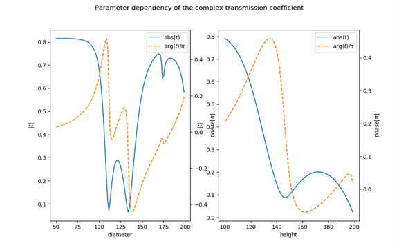 納米片半徑和高度的變化會影響相位和透射率。這個光譜特性使用腳本data_analysis/run_scan_geometry.py來研究。在這里,納米片的直徑和高度發生了變化,并記錄了相位和透射的變化。