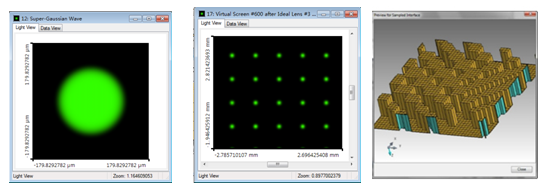 一個有效的光學建模要求將所有這些類型的元件和光源放在一個軟件平臺上進行高精度且快速的仿真模擬。VirtualLab Fusion是在VirtualLab場追跡模擬引擎的基礎上,新增了功能強大的幾何場追跡模擬引擎。經典場追跡模擬引擎統一了從幾何光學到電磁場方法的各種建模技術。在光學模擬與設計中包含了衍射、干涉、部分相干、像差、偏振等各種物理效應,從而能夠高精度的進行光學模擬與設計。而幾何場追跡模擬引擎則是通過使用幾何光學的方法來近似求解麥克斯韋方程組,從而能夠快速的完成各種復雜光學系統的模擬仿真,同時在模擬過程中包含了除衍射外的各種物理效應。經典場追跡模擬引擎與幾何場追跡模擬引擎的聯合使用,既能夠保證光學系統模擬和設計的精度,又能夠保證其速度,是物理光學和幾何光學的完美結合。最后,其傳統的光線追跡模擬引擎能夠快速的完成光學系統的性能評估。(下圖:光線追跡、幾何場追跡、經典場追跡)